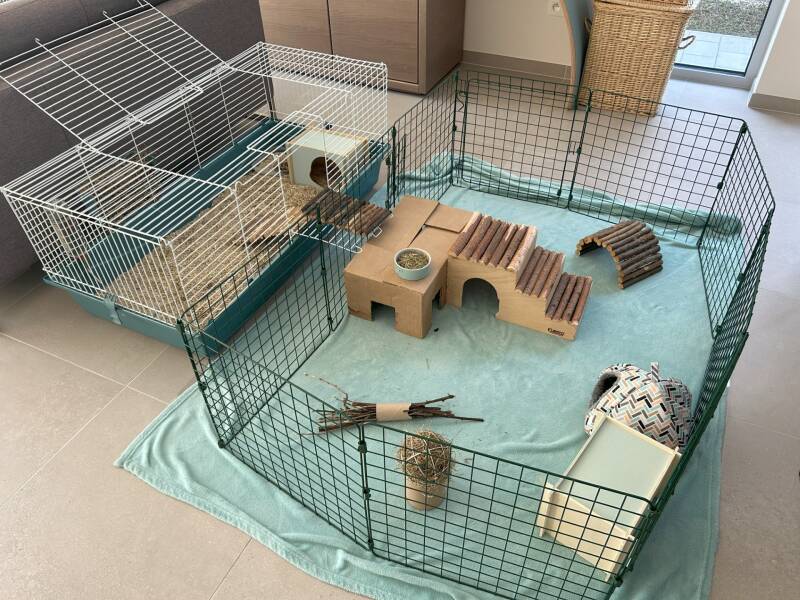 Daarbij nog een ren (Omlet-caviaspeelren Zippi starterspakket) met 10 panelen van 48x48cm elk. Zoals de opzet hier op foto's is, meet de ren 144 cm x 96 cm. Deze ren is  nog uit te breiden met meerdere panelen, maar ook met een dakbedekking, tunnelsysteem enz... Dus ook wel een leuk idee! Als ondergrond voor de ren is hier gekozen voor een pvc tafelzeil met daarover een fleecedeken.