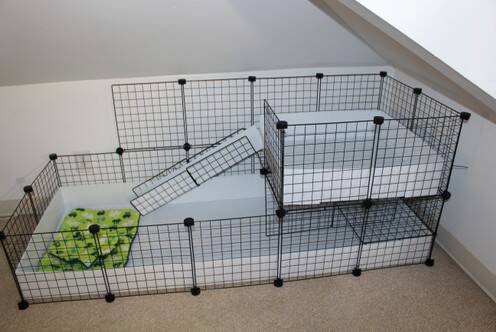 * Heb je gewoon een standaard hok (120x60) en wil je ze toch meer ruimte gunnen ? Dan kan je werken met een rennetje dat je in verbinding zet met hun hok. Voorbeeld hiervan kan je onderaan de pagina vinden bij : "voorbeelden bij baasjes thuis"