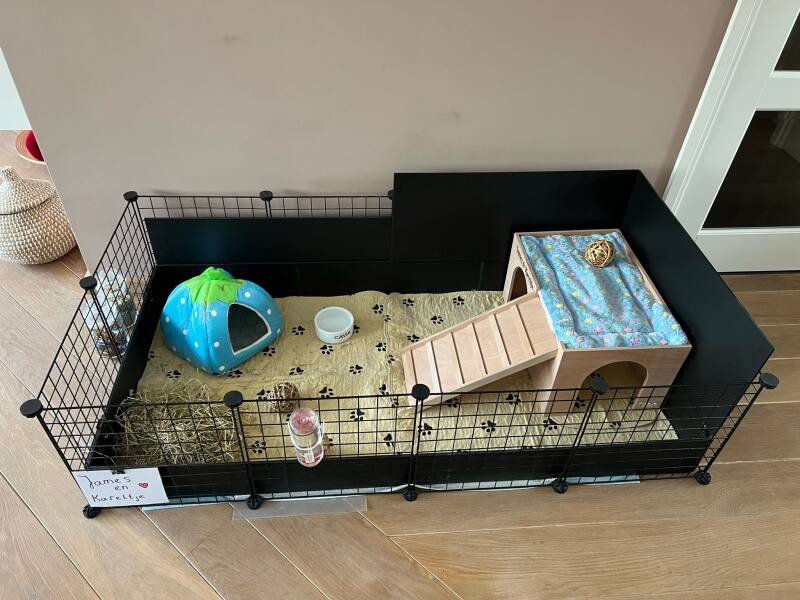 Het hok is bijzonder praktisch dankzij het onderstel, dat in dit geval een kast is, door het baasje zelf aangepast. Hierdoor zitten de cavia's hoger, wat hen een mooi overzicht geeft. Tegelijkertijd is het voor jou als eigenaar handig, omdat het schoonmaken een stuk gemakkelijker is zonder diep te hoeven bukken.