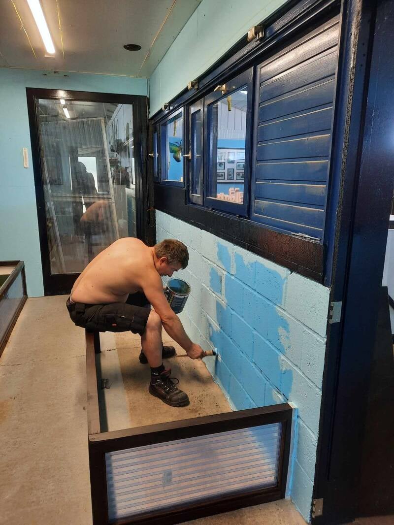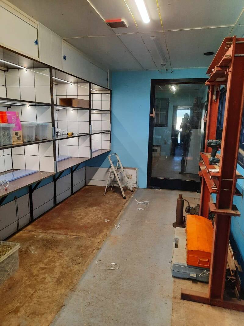 26-06-2024 : En de werken gaan verder... Vandaag heeft Koen vooral verfwerken gedaan, muur opgefrist, rondom de binnendeur geverfd, de vloer een eerste keer geverfd. Verder nog wat ledverlichting gehangen en aangesloten, het begint aardig op te schieten.