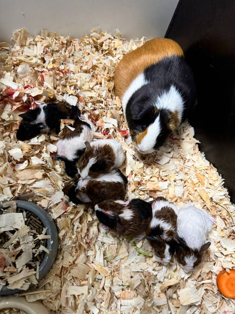 04-01-2026 : Vanmiddag was ik bezig met alle cavia's onder handen te nemen : nagels knippen, oortjes zuiver maken waar nodig, vachtjes nakijken en druppelen. Het ging goed vooruit, iedereen deed zijn best. Opeens hoorde ik een piepje...dus meteen bij Paige even voelen of ze al meer opening had. Ze was kletsnat aan haar poep, dus het was echt wel tijd. Om 15.25u ongeveer kreeg ze haar eerste jong, amper een 10tal minuten na het piepje. En om 15.40u had ze 3 jongen en had ze ook al 2 nageboortes opgeruimd. Over een vlotte bevalling gesproken, zo mogen ze allemaal verlopen dit jaar, echt super ! Paige kreeg 2 beertjes en 1 zeugje. Heel mooi van tekening, maar helaas te licht van kleur om aan te houden. Al zit er 1 beertje bij in zwart/rood/wit (redelijk lichte tint rood) met heel mooie aftekening. Blokjes op de rug, blokjes op de buik, echt supermooi. Maar ik moet heel streng zijn en enkel de donkerste beertjes aanhouden om mee verder te gaan. Uiteindelijk willen we natuurlijk ons doel weer halen en dat zijn mooi donkere zwart/rood/witte dieren. Maar goed, Paige heeft dat supergoed gedaan en ze is ook heel goed bezig met haar jongen. Dit is haar tweede nestje, ze hoeft er geen meer te krijgen, ze heeft haar best gedaan. Ze mag gaan genieten. Eventueel mag ze zelfs verhuizen samen met haar dochtertje, we zullen zien. Er zijn al aanvragen voor de baby's, dus even afwachten hoe het verloopt.