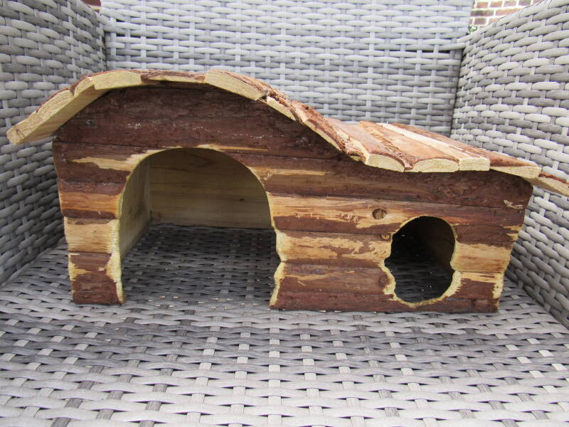 - Huis uit wilgenhout, perfect om aan te knagen. Zoals je op foto kan zijn hebben ze dat ook al gedaan. Je eigen cavia's zullen deze werken ongetwijfeld verder zetten.